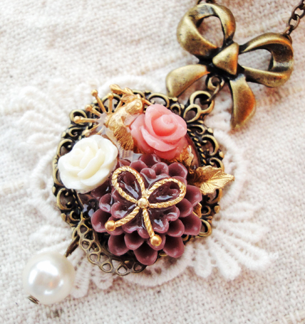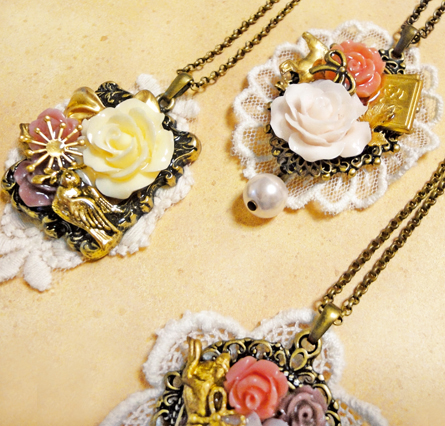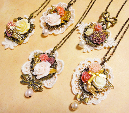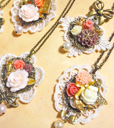 フラワーカボションやリボン、レースなどをモチーフにレジンアクセサリーを作成しています。