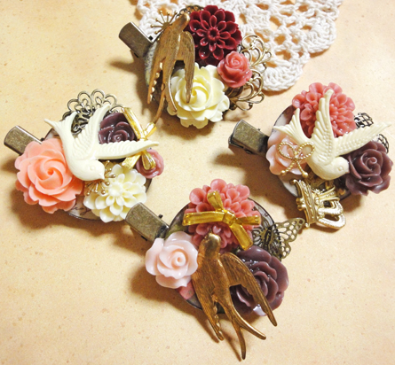 こちらも2点目と同じツバメモチーフを使ったバージョン違いです!色やパーツを変えてます^^白やボルドー系の花を入れてみました。