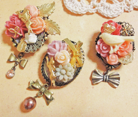 さて、今日はブローチをご紹介しますね!いつも同じ形のセッティングでしかブローチは作っていなかったのですが、今回ご紹介するのは3型あります!リボンやキラキラのチャームを付けてみました^^