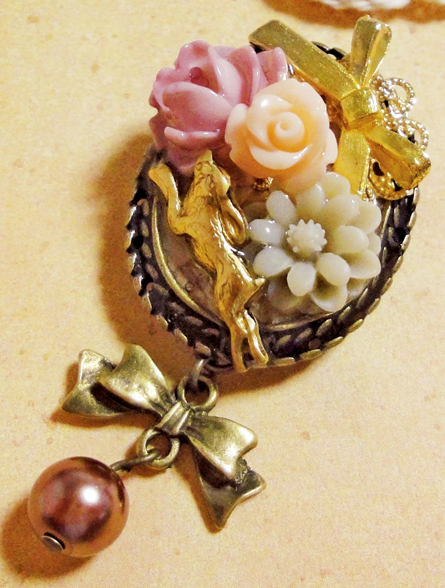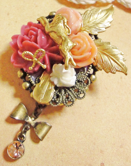 一個目のものと似てますが、バラのピンク色がこちらのほうが少々明るめです。あと緑色のカボションが入ってます。