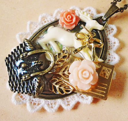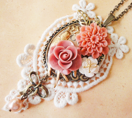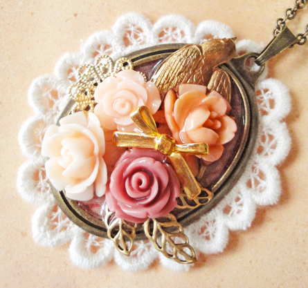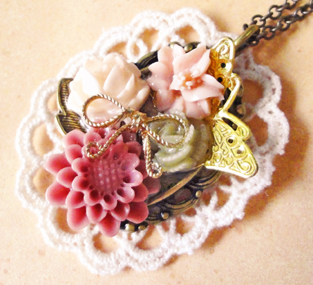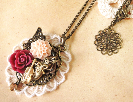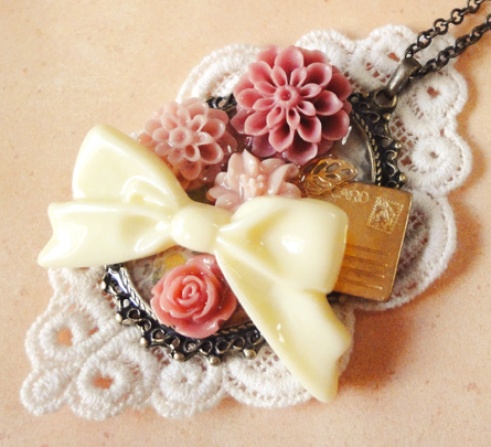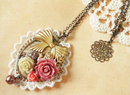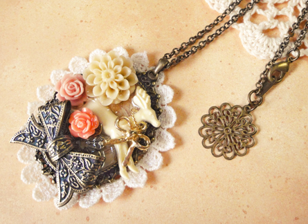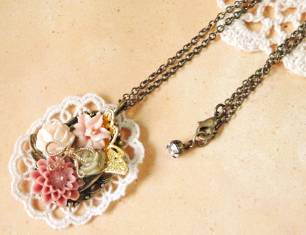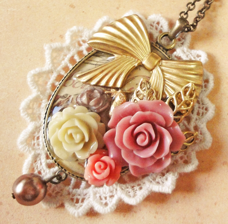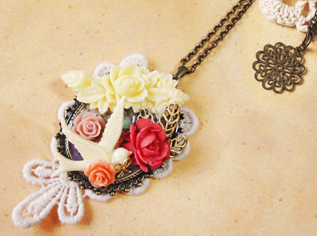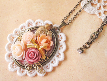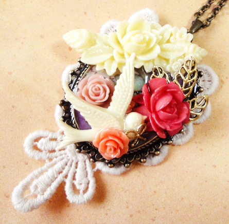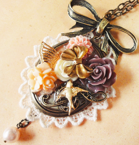今日は、昨日も登場したゴールドの鳥チャームを使った作品です。 昨日は円形でしたが、今日は楕円のセッティングです。昨日の円形のほうはレースもシックなブラウン系を使用しましたが、今日はアイボリー系です^^