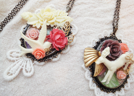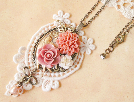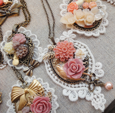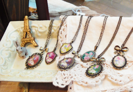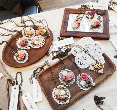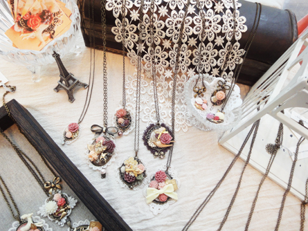 フラワーカボションやリボン、レースなどをモチーフにレジンアクセサリーを作成しています。