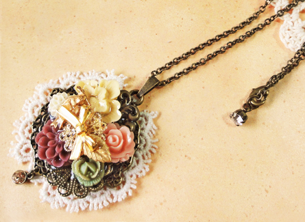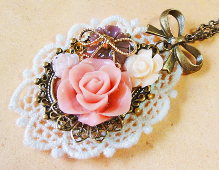 フラワーカボションやリボン、レースなどをモチーフにレジンアクセサリーを作成しています。