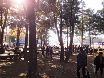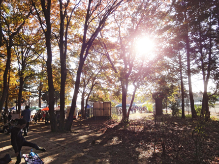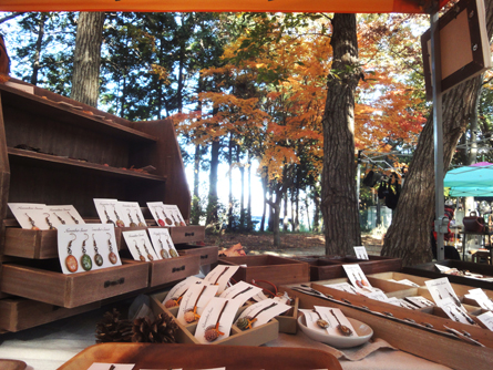 屋外イベントは何度も経験しましたが、今回のような森の中という感じの、樹々の中でのロケーションは初めてです!とても気持ちのいい会場でした。湖もきれいで、お天気もよく、紅葉も見頃で、たまに落ち葉が舞い散り、なんともいい雰囲気でした^^