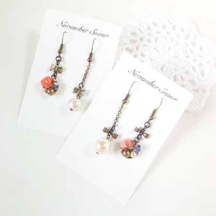 小さなセッティングに盛り込んだプチピアスと、リボンとコットンパールのセットです。