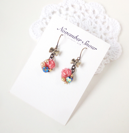 フラワーカボションやリボン、レースなどをモチーフにレジンアクセサリーを作成しています。