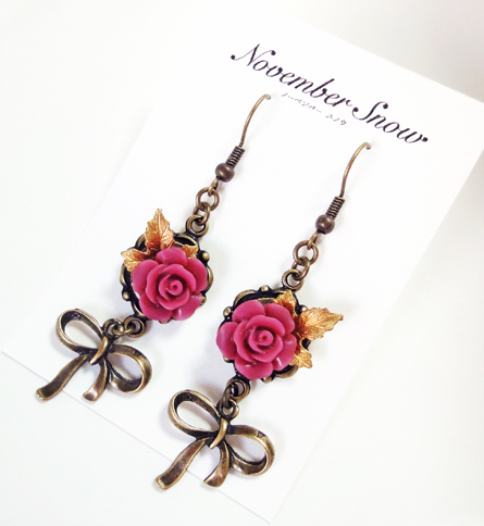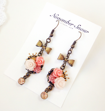 フラワーカボションやリボン、レースなどをモチーフにレジンアクセサリーを作成しています。